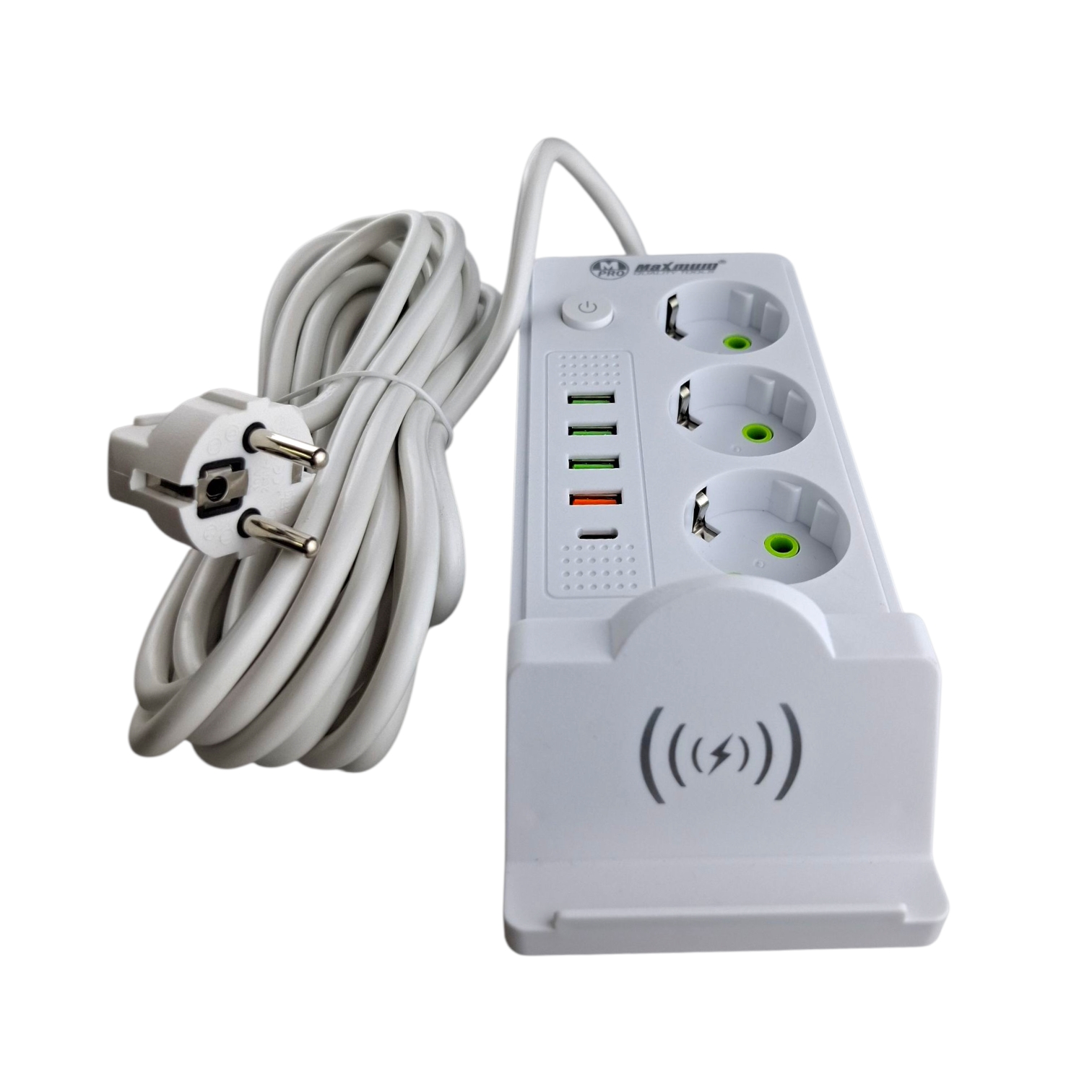 Белый сетевой фильтр с беспроводной зарядкой на 3 метра от "Maximum Quality Tools" оборудован тремя розетками евро типа с заземлением, а также 4 USB портами и входом Type C.