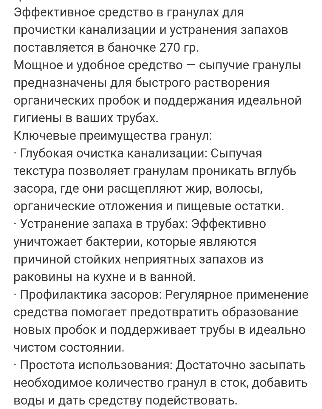 · Простота использования: Достаточно засыпать необходимое количество гранул в сток, добавить воды и дать средству подействовать.