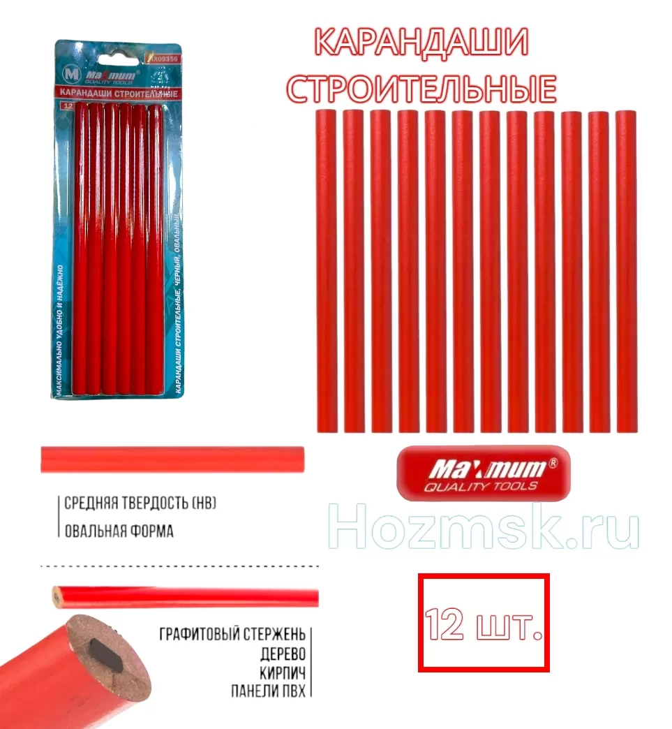 Карандаши строительные 12 шт., графит, овальные, "MAXIMUM" MX 09356