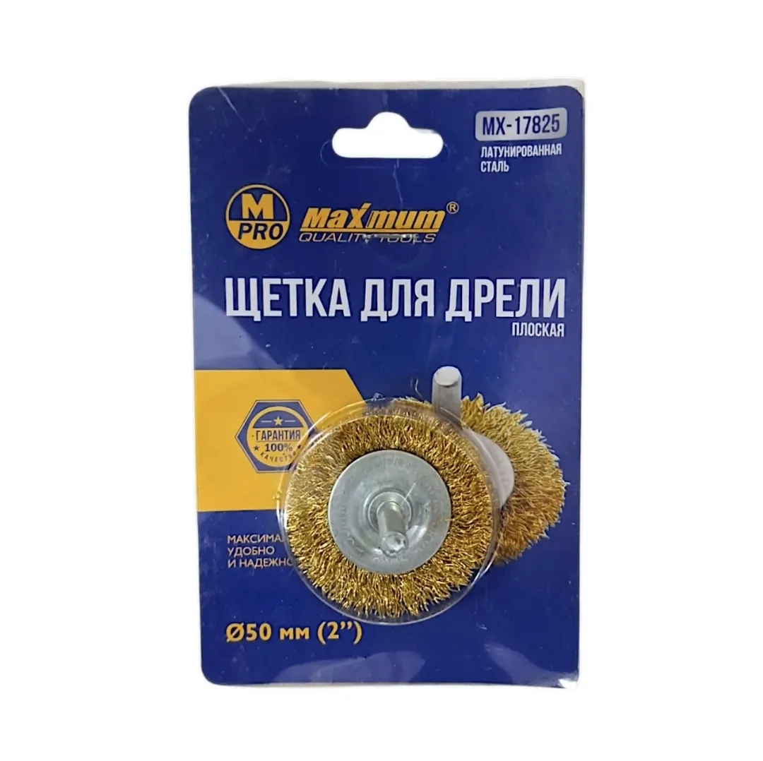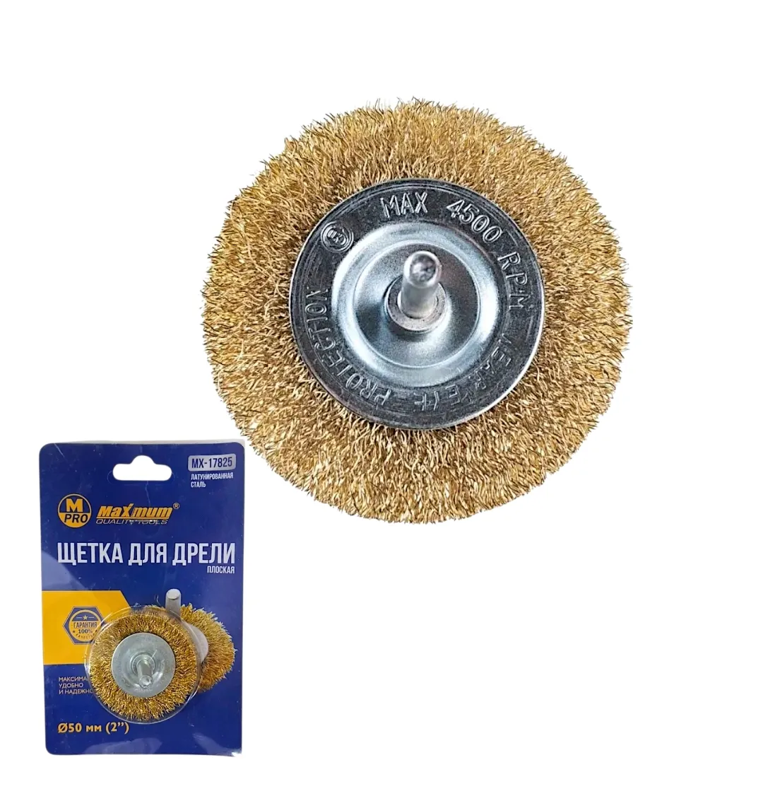 Плоская щетка с проволочной щетиной из латуни 50 мм от "MAXIMUM QUALITY TOOLS" крепится на дрель или шуруповерт через резьбовую шпильку.