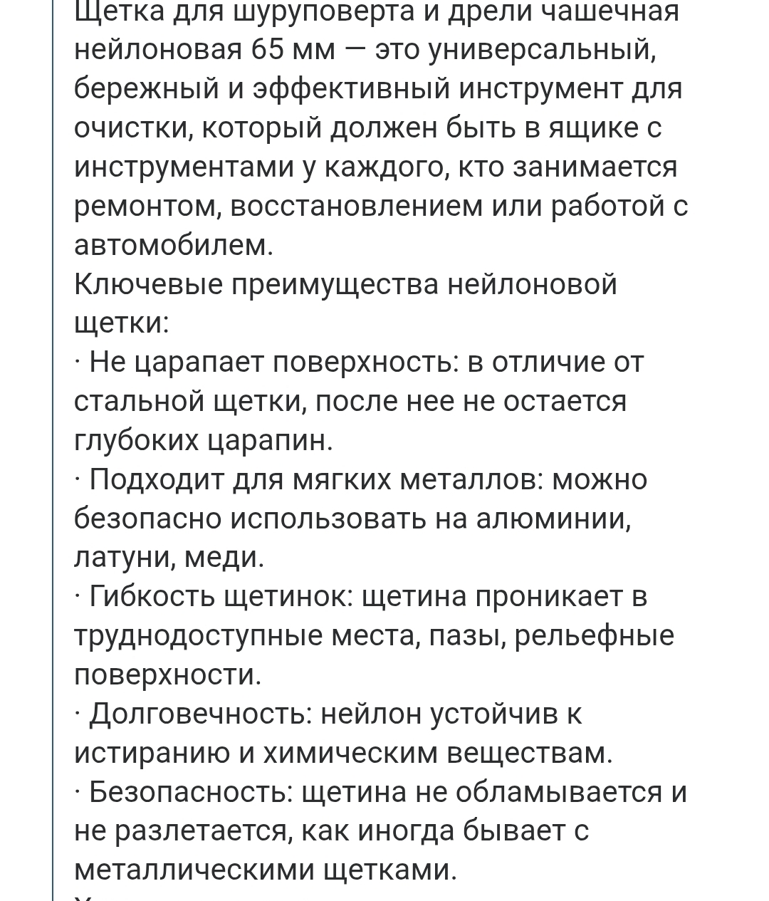 Щетка для шуруповерта и дрели чашечная нейлоновая 65 мм — это универсальный, бережный и эффективный инструмент для очистки, который должен быть в ящике с инструментами у каждого, кто занимается ремонтом, восстановлением или работой с автомобилем.